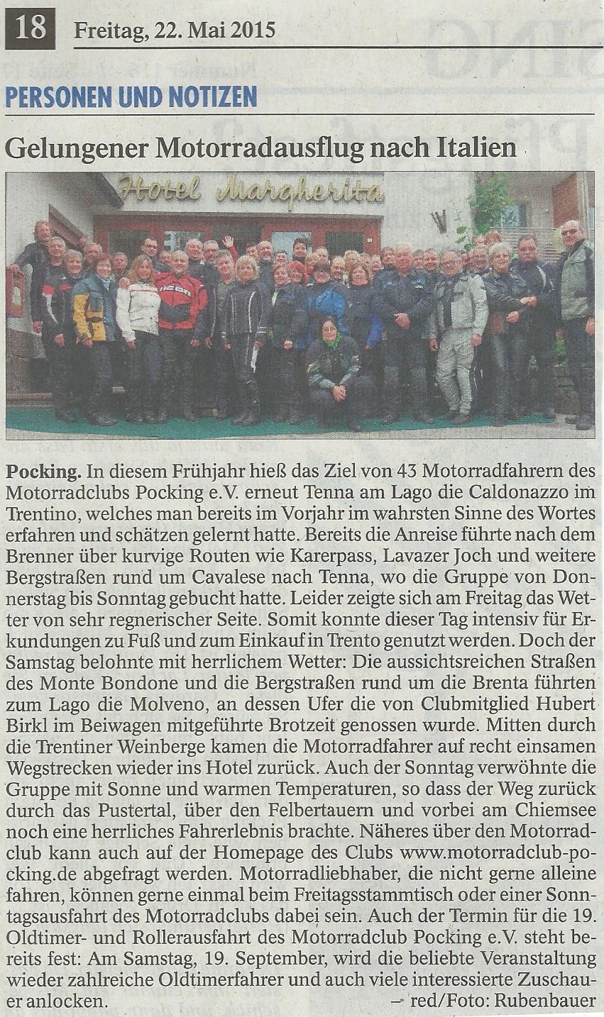 Über die Eröffnungsfahrt nach Tenna im Trentino, Bericht vom 22.05.2015